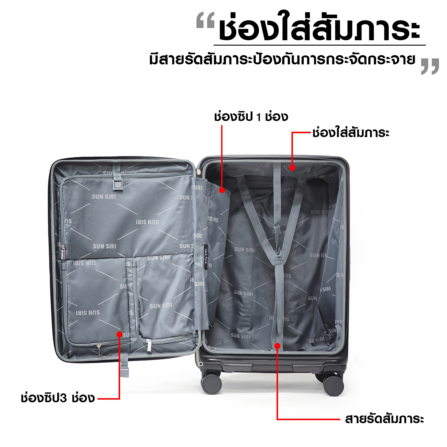 - ด้านในกระเป๋ามีสายรัดป้องกันสัมภาระกระจัดกระจาย